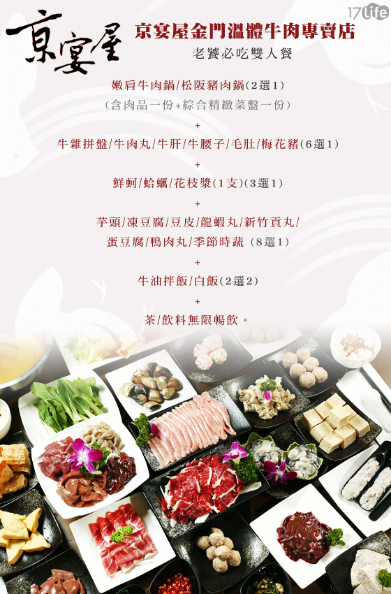 商品訊息簡述: 只要599元(雙人價)即可享用【京宴屋金門溫體牛肉專賣店】原價902元老饕必吃雙人餐:嫩肩牛肉鍋/松阪豬肉鍋(含綜合精緻菜盤x1+肉盤x1)+牛雜拼盤/牛肉丸/牛肝/牛腰子/毛肚/梅花豬(6選1)+鮮蚵/蛤蜊/花枝漿(1支)(3選1)+芋頭/凍豆腐/豆皮/龍蝦丸/新竹貢丸/蛋豆腐/鴨肉丸/季節時蔬(8選1)+牛油拌飯/白飯(2選2)+茶、飲料無限暢飲。