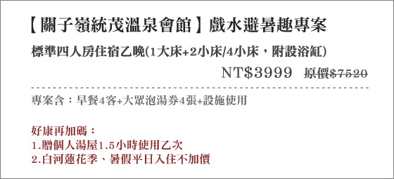 商品訊息簡述: 只要3999元(奶H價)即可享【關子嶺統茂溫泉滅]】原價7520元戲水避暑趣專案:標準奶H房住宿乙晚(1大床+2小床/4小床,附設浴缸)+早餐4客+大眾泡湯券4張+設施使用,好康再加碼:1.贈個人湯屋1.5小時使用乙次、2.白河蓮花季、暑假平日入住不加價!
